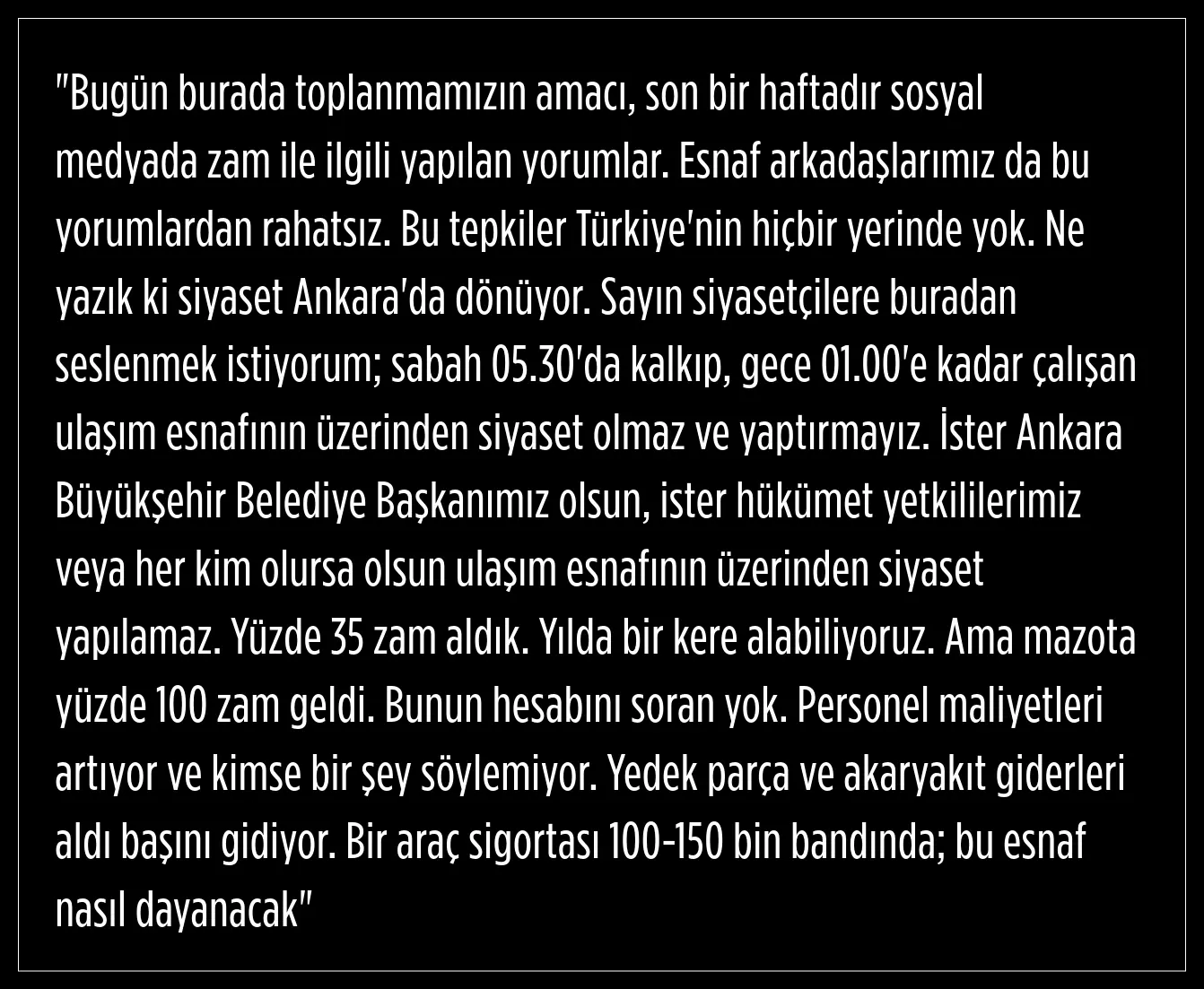 Ankara’da toplu ulaşıma gelen %35’lik zam sonrası özel halk otobüsü esnafı, artan maliyetler ve tepkilere karşı ''siyaset'' vurgulu açıklama yaptı.