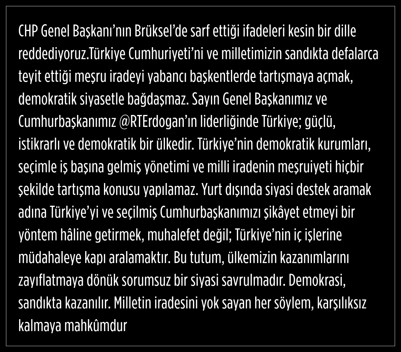 İleri, CHP Genel Başkanı’nın Brüksel’de sarf ettiği ifadeleri kesin bir dille reddettiklerini söyledi.