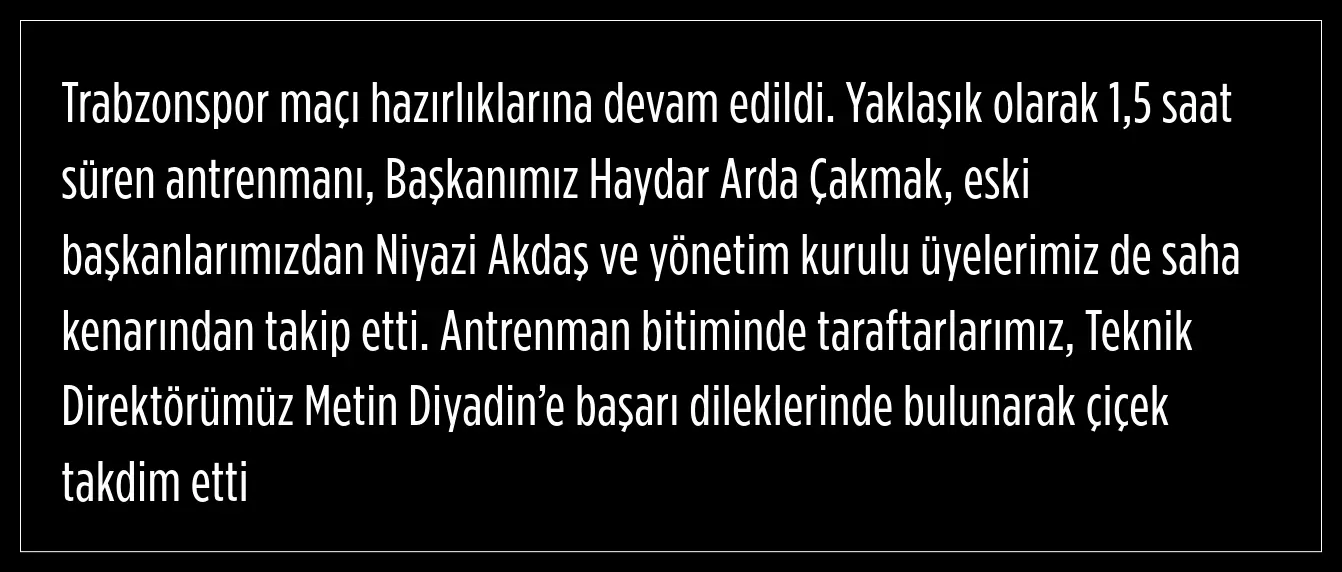 Öte yandan antrenman sonrasında taraftarların Metin Diyadin’e başarı dilediği ve çiçek takdim ettiği aktarıldı.