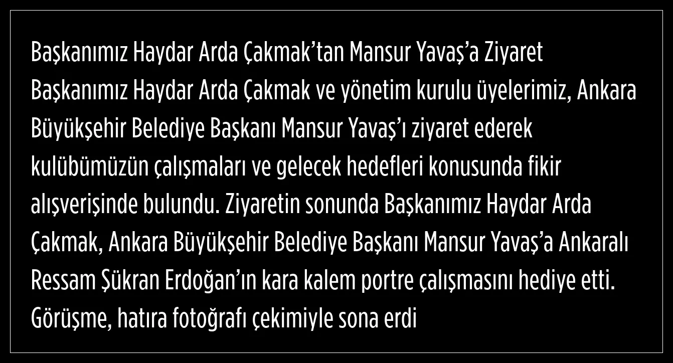 Geçtiğimiz haftalarda Gençlerbirliğİ'nin başına gelen Haydar Arda Çakmak, ziyaretlerini sürdürüyor. Son olarak ABB Başkanı Mansur Yavaş'la bir görüşme gerçekleştirildi. Görüşmede, Takımın durumu masaya yatırılırken, Yavaş'a kara kalem portre çalışması hediye edildi.