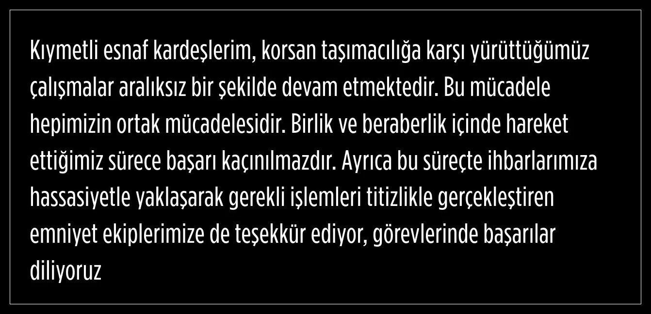 Mehmet Yiğiner, korsan taşımacılığa karşı yürüttüklerin çalışmaların sürdüğünü, mücadelenin herkesin ortak bir mücadelesi olduğunu ifade etti.