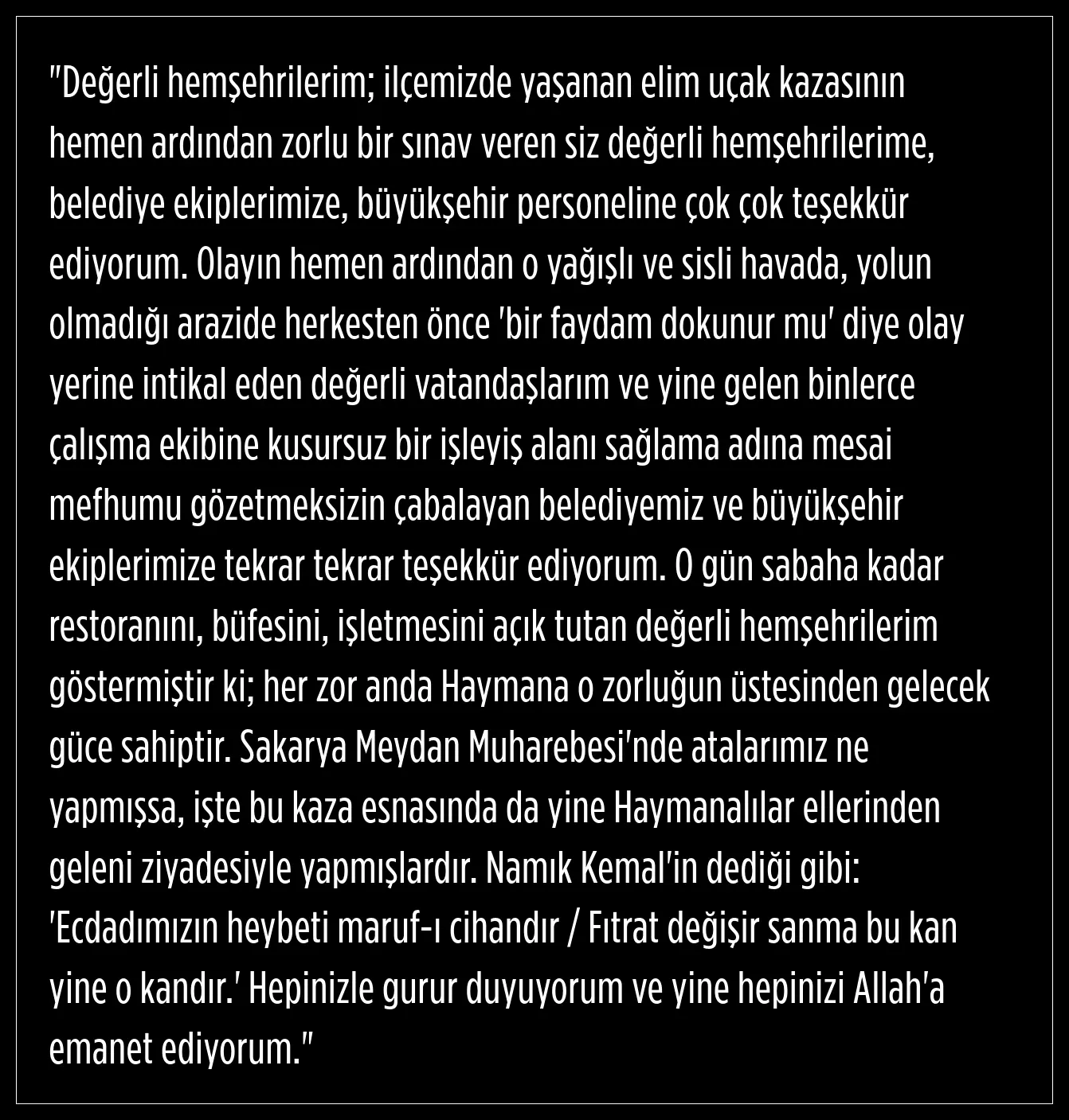 Başkan Koç, mesajında Haymana’nın tarihsel hafızasına da atıf yaptı. Sakarya Meydan Muharebesi döneminde gösterilen mücadele ruhunu hatırlatan Koç, kazada da vatandaşların elinden geleni yaptığını dile getirdi. Namık Kemal’den alıntı yapan Koç, hemşehrileriyle gurur duyduğunu belirterek mesajını dua ve temennilerle tamamladı.