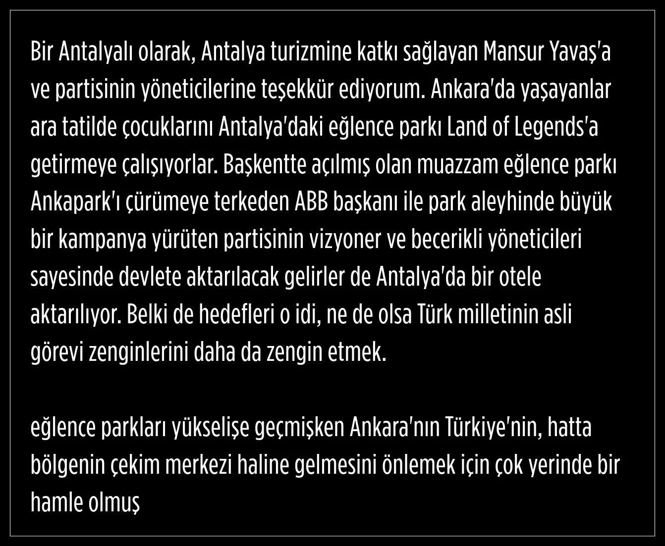 Mansur Yavaş'ın ve parti yöneticilerinin Antalya turizmine katkı sağladığını ifade ederek, teşekkürlerini iletti. Yavaş, Ankara'da yaşayanların ara tatilde çocuklarını Antalya'daki eğlence parkı Land of Legends'a getirmeye çalıştığını söyledi.