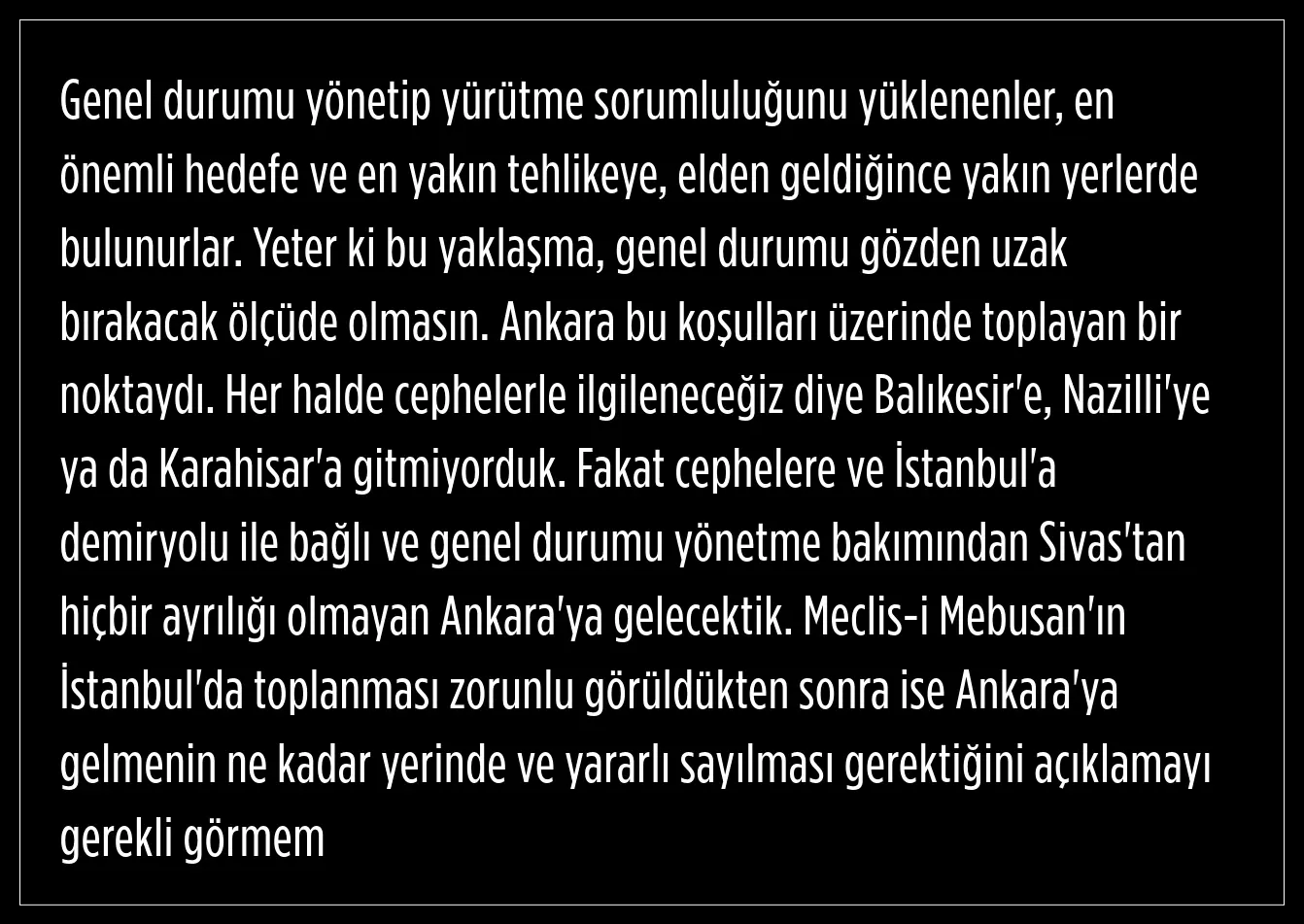 Mustafa Kemal Atatürk, Nutuk'ta Ankara'ya gelişini şu sözlerle anlattı: