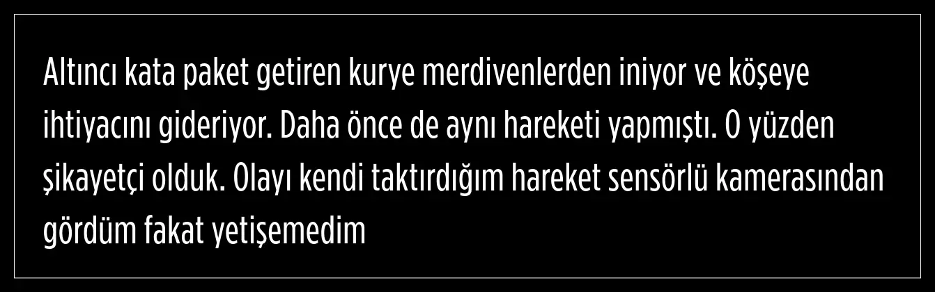 Ankara'da bir kuryenin sipariş getirdiği binaya tuvaletini yaptı. Daha öncesinde de kuryenin aynı hareketi yaptığı öğrenilirken, kuryeden şikayetçi olundu.