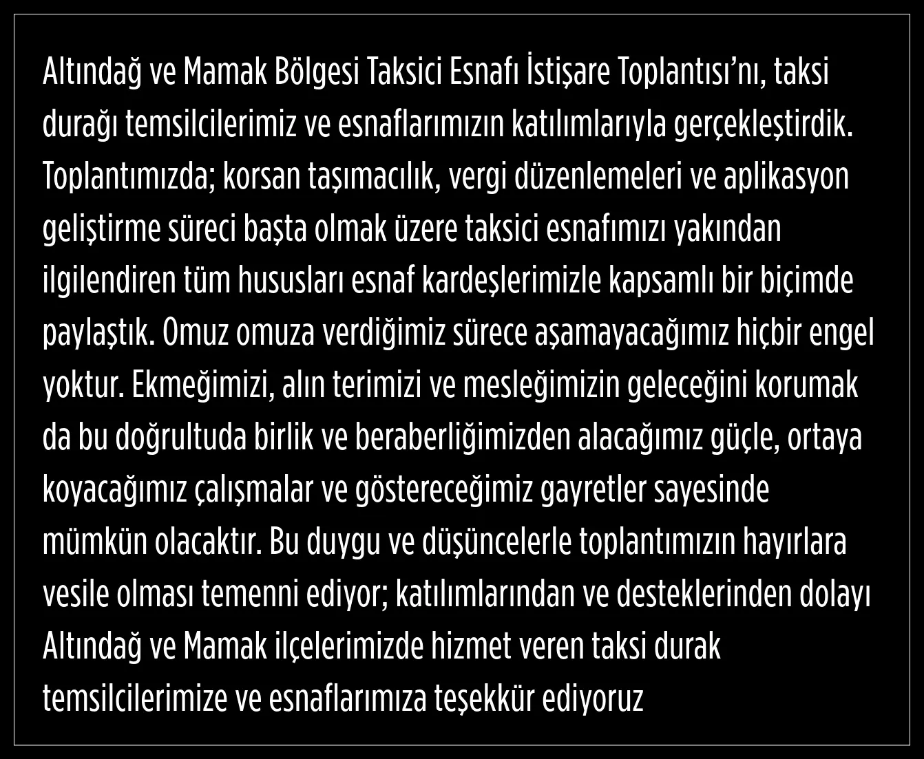 Sosyal medya hesabı üzerinden bir paylaşım yapan Mehmet Yiğiner, korsan taşımacılık, vergi düzenlemeleri ve aplikasyon geliştirme süreci başta olmak üzere taksici esnafını yakından ilgilendiren tüm hususların masaya yatırıldığını ifade etti.