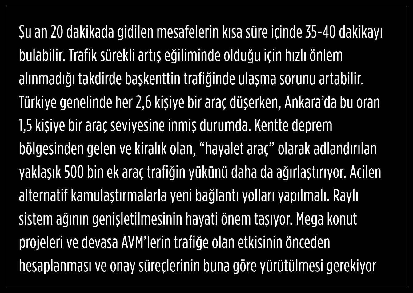 Yapılan açıklamada, şu anda 20 dakikada gidilen mesafenin kısa süre içinde 35-40 dakikayı bulabileceği, trafiğin sürekli artış eğiliminde olduğu için hızlı önlem alınmadığı takdirde başkent trafiğinde ulaşma sorununun artabileceği kaydedildi.