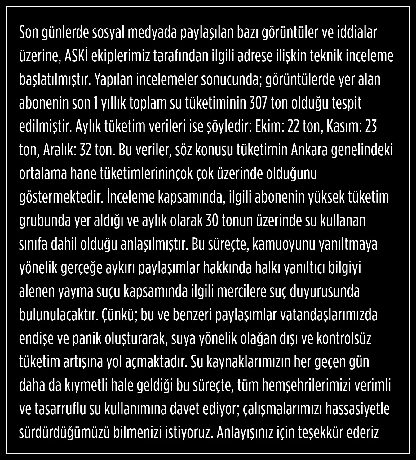 Açıklamada, bu ve benzeri paylaşımlar vatandaşlarında endişe ve panik oluşturduğu, suya yönelik olağan dışı ve kontrolsüz tüketim artışına yol açtığı ifade edildi.