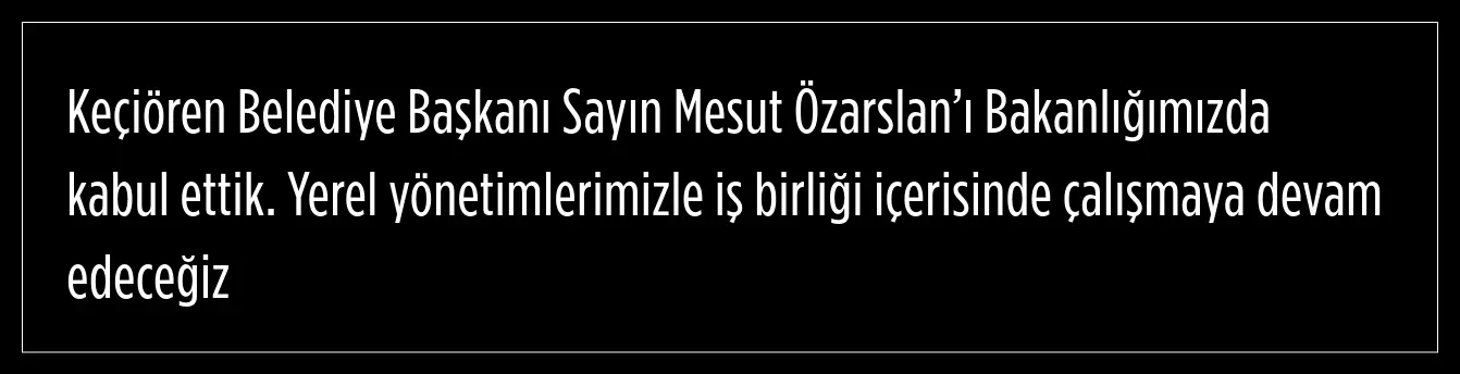 Murat Kurum da sosyal medya hesabı üzerinden yaptığı paylaşımda ise, Keçiören Belediye Başkanı Mesut Özarslan’ı bakanlıkta kabul ettiklerini ifade ederek, yerel yönetimlerle iş birliği içerisinde çalışmaya devam edeceklerini kaydetti.
