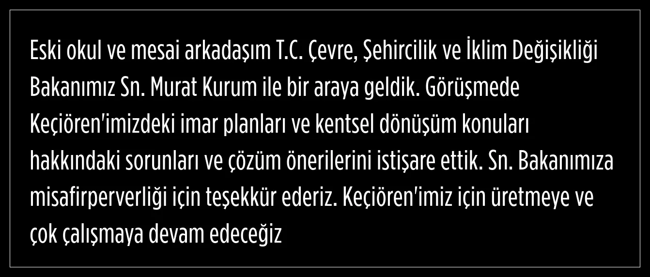 Çevre, Şehircilik ve İklim Değişikliği Bakanı Murat Kurum, Keçiören Belediye Başkanı Mesut Özarslan'ı makamında kabul etti. Görüşmede, Keçiören'deki imar planları ve kentsel dönüşüm konuları masaya yatırıldı. Kurum, yerel yönetimlerle iş birliği içerisinde çalışmaya devam edeceklerinin mesajını verdi.
