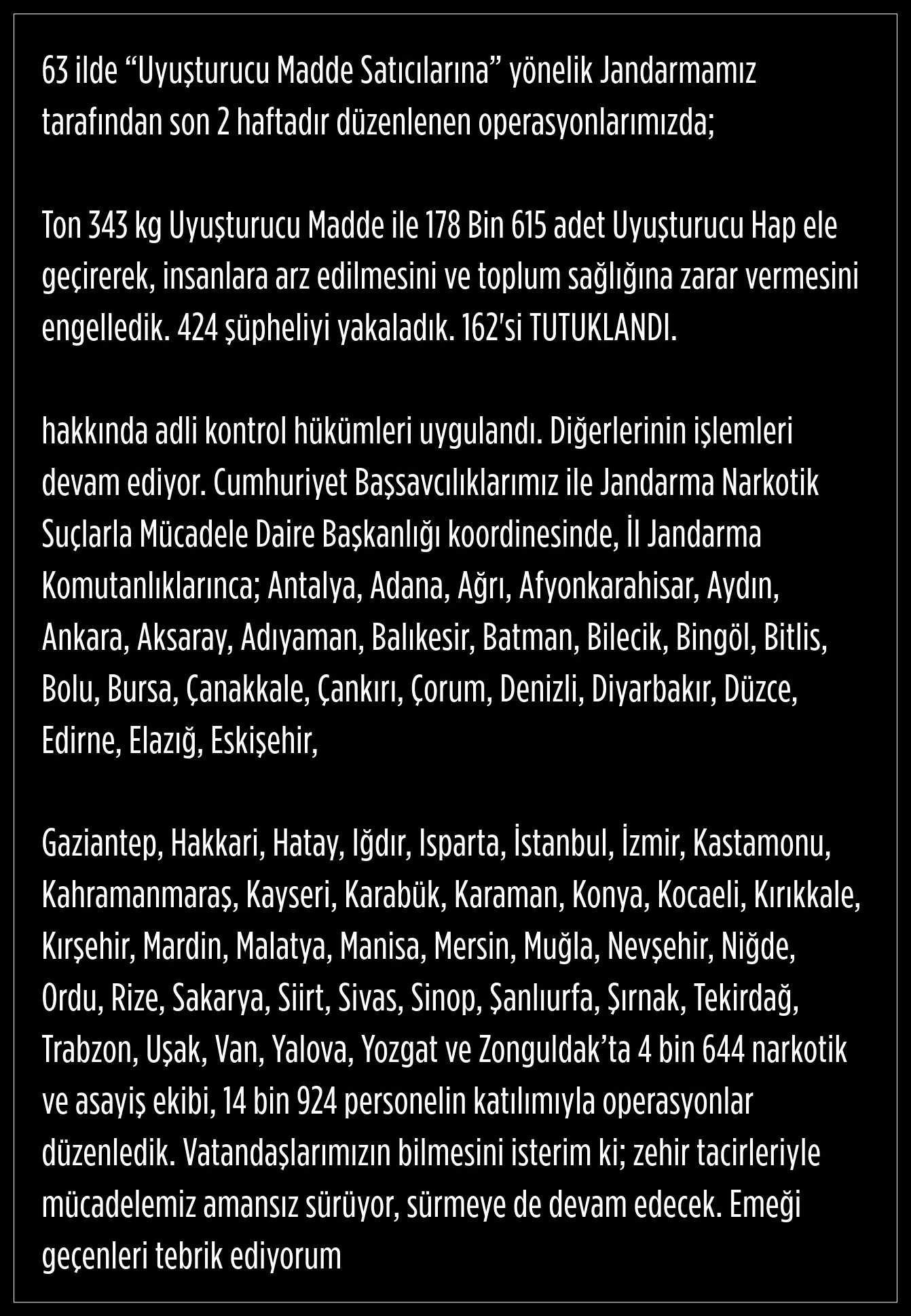 Yerlikaya, Jandarma tarafından son 2 haftadır düzenlenen operasyonlarda, 1 Ton 343 kg Uyuşturucu Madde ile 178 Bin 615 adet Uyuşturucu Hap ele geçirildiğini söyledi.