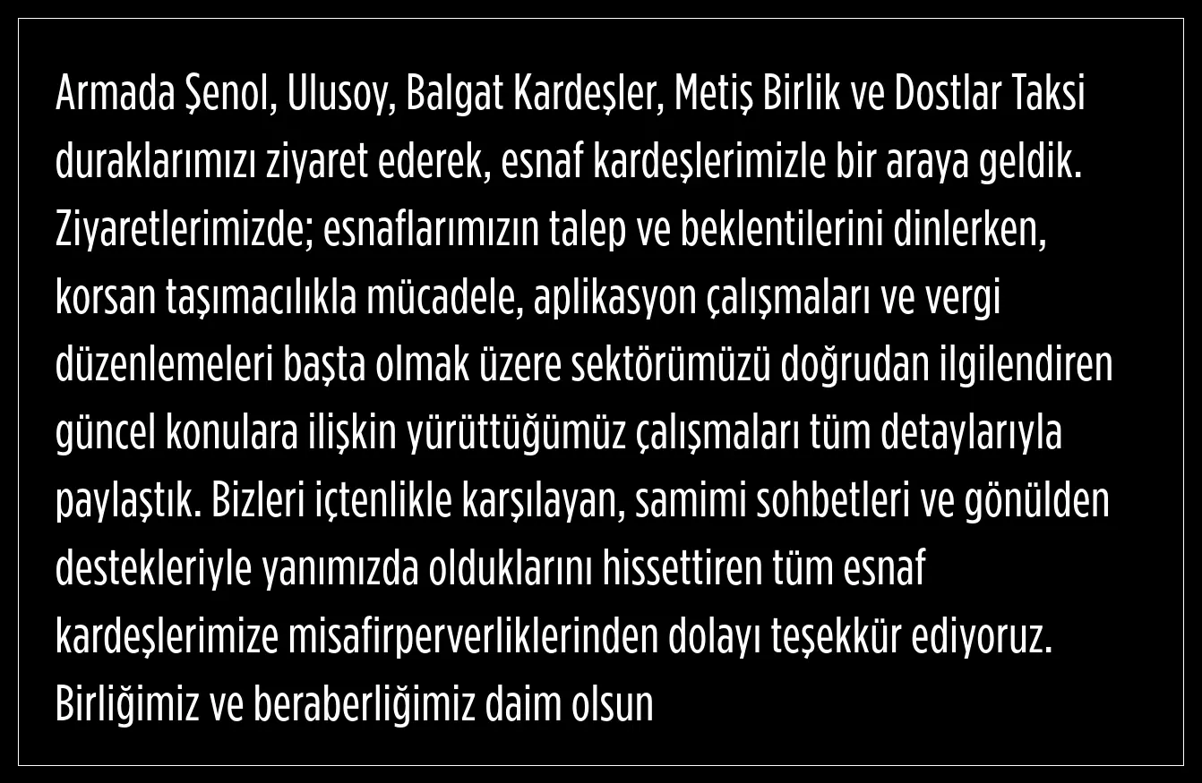 Ankara Umum Otomobilciler ve Şoförler Esnaf Odası Başkanı Mehmet Yiğiner, durak ziyaretleri yaparak esnafla bir araya gelmeye devam ediyor.