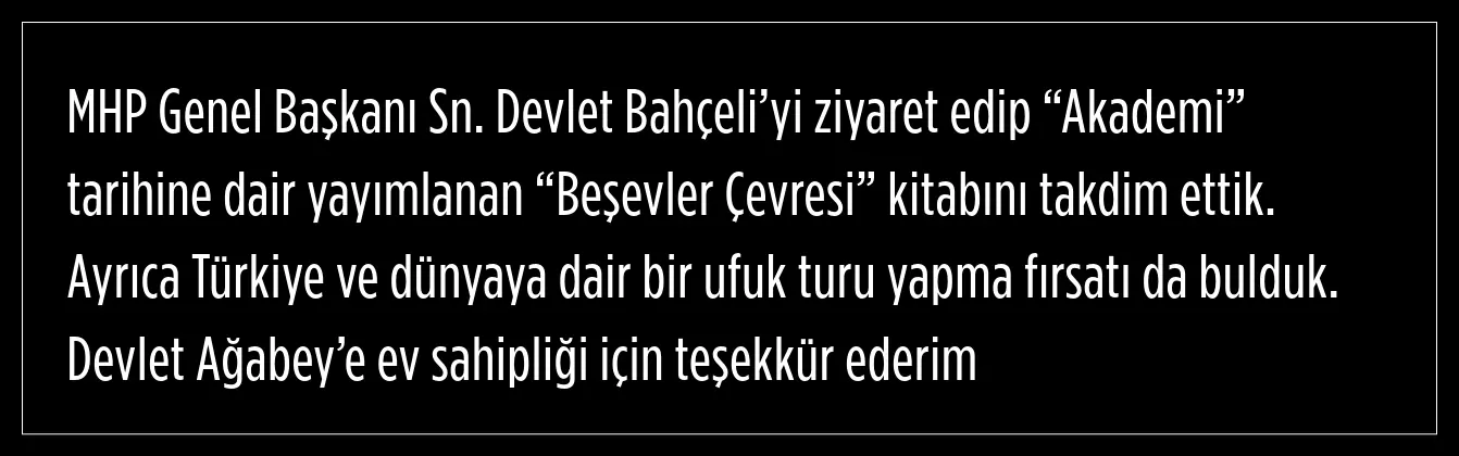 Bilgin, Bahçeli'ye görüşmede, “Akademi” tarihine dair yayımlanan “Beşevler Çevresi” kitabını hediye etti.