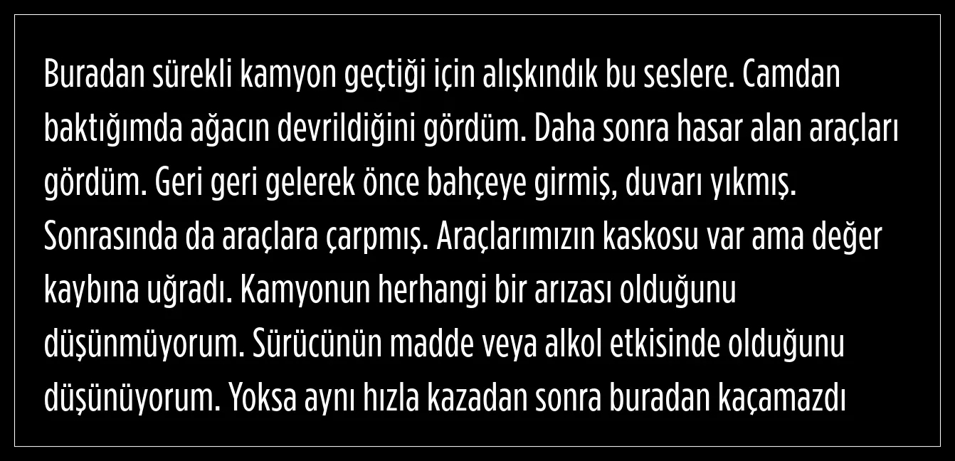 Sabah büyük bir gürültüyle uyandıklarını ifade eden Sonel, kamyon sürücüsünün olayın ardından kaçtığını söyledi.