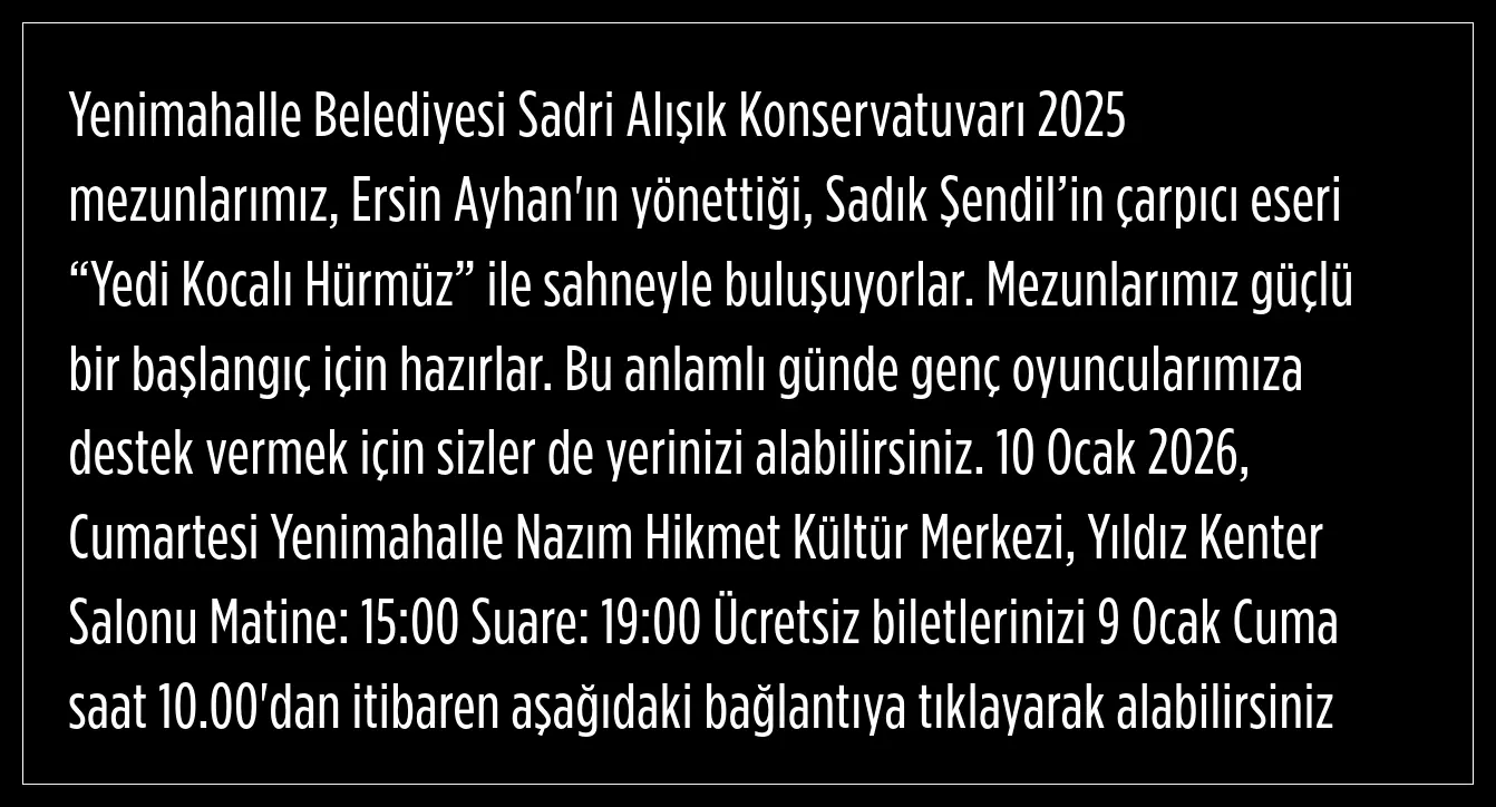 Yenimahalle Belediyesi Sadri Alışık Konservatuvarı mezunları, “Yedi Kocalı Hürmüz” oyunu ile izleyicisiyle buluşacak. Yarın sahnelenecek olan oyun, iki ayrı seanstan oluşacak. Bilet için alımlar 10.00 itibariyle başladı.