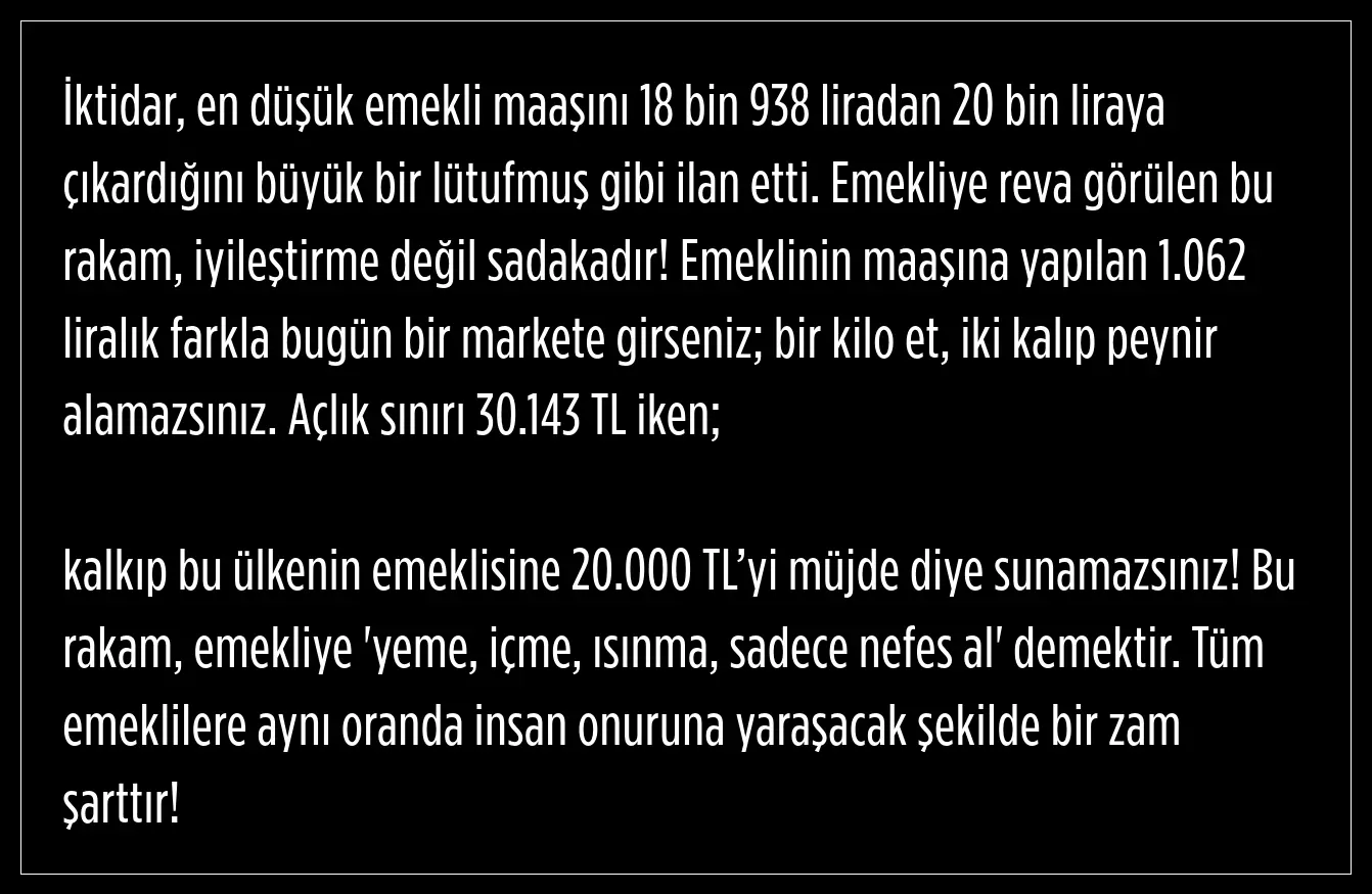 Semra Dinçer, açlık sınırı 30.143 TL iken emekliye 20.000 TL’nin müjde olarak sunulamayacağını ifade etti. Dinçer, bu rakamın emekliye 'yeme, içme, ısınma, sadece nefes al' demek olduğunu kaydetti.