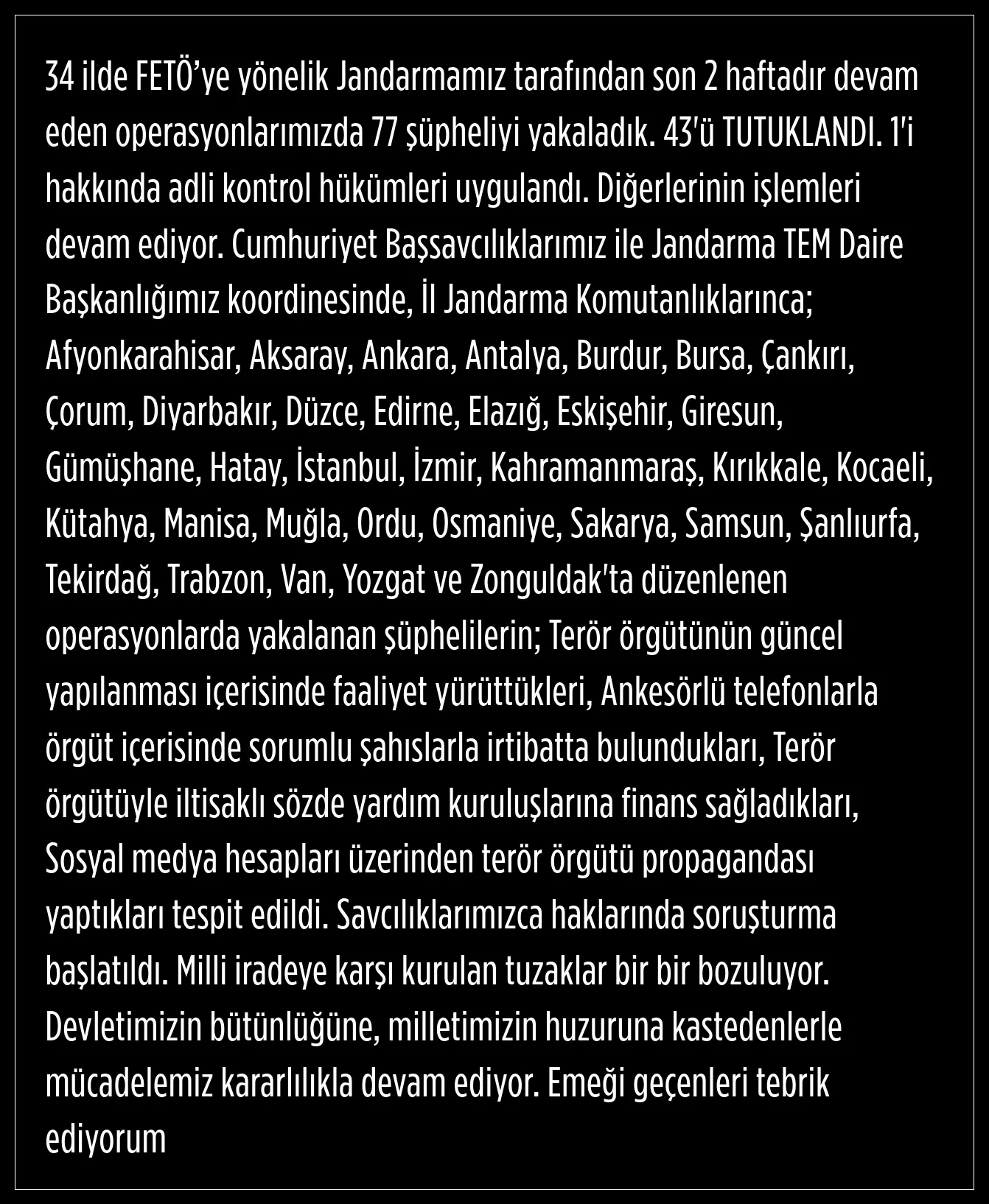 Ali Yerlikaya, Cumhuriyet Başsavcılıkları, Jandarma TEM Daire Başkanlığı koordinesinde, İl Jandarma Komutanlıklarınca düzenlenen operasyonlarda yakalanan şüphelilerin, terör örgütünün güncel yapılanması içerisinde faaliyet yürüttüklerinin, ankesörlü telefonlarla örgüt içerisinde sorumlu şahıslarla irtibatta bulunduklarının, terör örgütüyle iltisaklı sözde yardım kuruluşlarına finans sağladıklarının, sosyal medya hesapları üzerinden terör örgütü propagandası yaptıklarının tespit edildiğini söyledi.