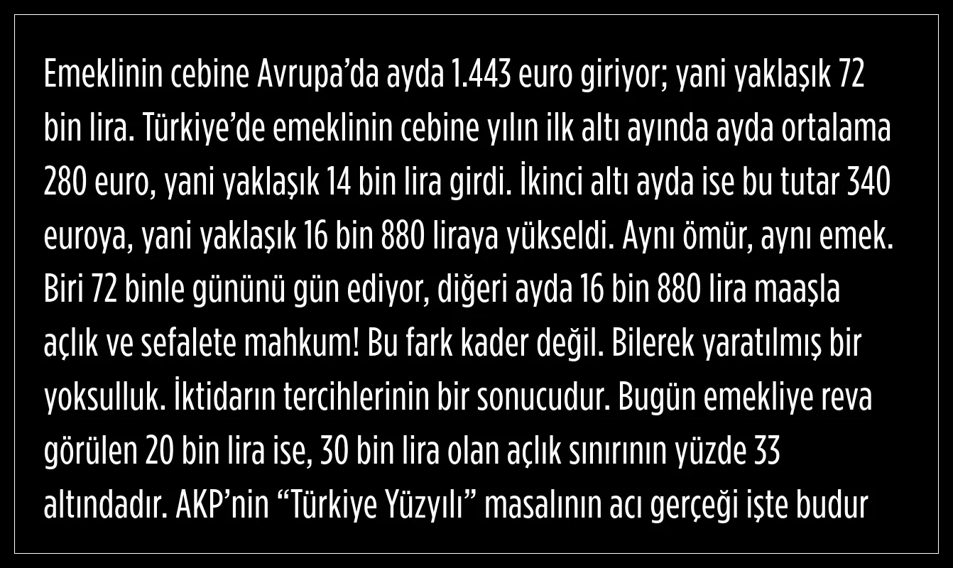 CHP'li isim, bugün emekliye reva görülen 20 bin liranın 30 bin lira olan açlık sınırının yüzde 33 altında olduğunu aktardı.