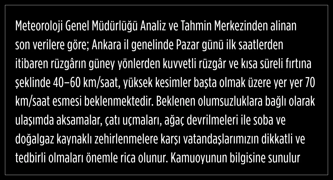 Ankara Valiliği, bu geceden itibaren yarın akşamüzeri 16.00'a kadar kuvvetli rüzgar ve fırtınanın beklendiğini ifade ederek, yaşanacak olumsuzluklara karşı dikkatli olunması gerektiğini belirtti.