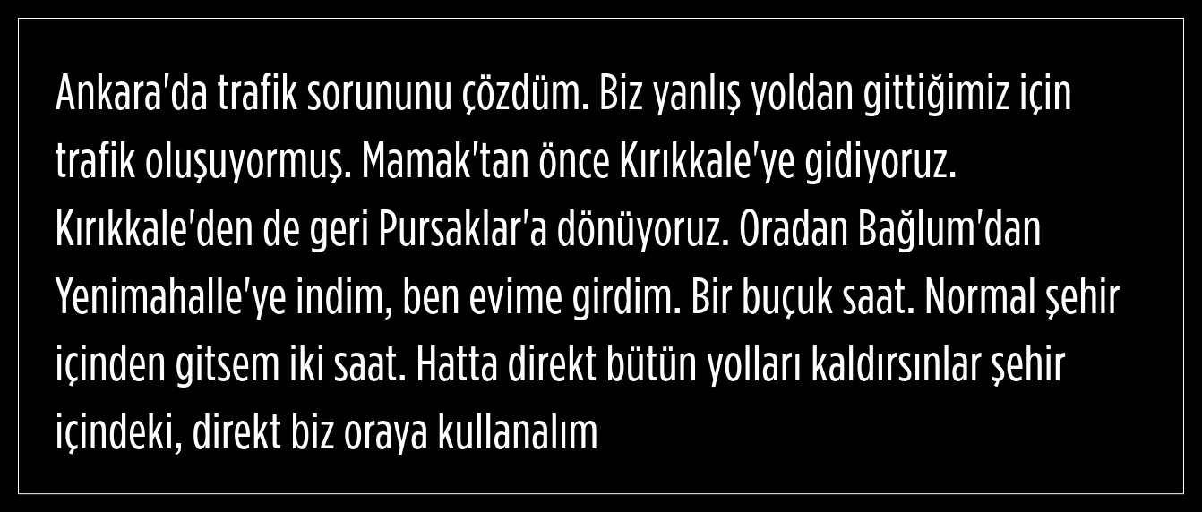 Vatandaş, ilk olarak Mamak'tan Kırıkkale'ye gittiğini, ardından Pursaklar'a döndüğünü ve Bağlum üzerinden Yenimahalle'ye indiğini söyledi.
