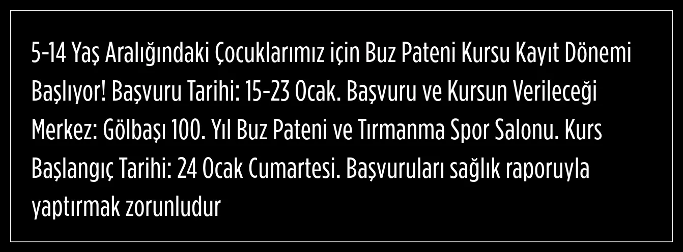 Gölbaşı Belediyesi, çocukların eğleneceği bir etkinliği duyurdu. Belediye, Buz Pateni Kursu için kayıtların başlayacağı açıklandı.