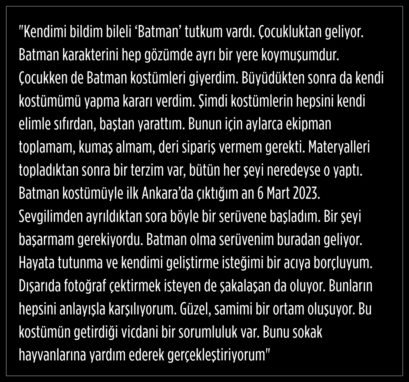 Yaklaşık 3 yıldır Ankara’da Batman karakteriyle dolaştığını belirten Arslan, bu tutkunun çocukluk dönemine dayandığını ifade etti. Arslan, Batman karakterini her zaman özel bir yere koyduğunu belirterek, kostümleri tamamen kendi imkanlarıyla sıfırdan yaptığını söyledi. Aylar süren hazırlık sürecinde ekipman ve kumaş topladığını, deri siparişleri verdiğini aktaran Arslan, Batman kostümüyle ilk kez 6 Mart 2023’te Ankara sokaklarına çıktığını dile getirdi. Arslan, kostümün kendisine vicdani bir sorumluluk yüklediğini ve bunu özellikle sokak hayvanlarına yardım ederek yerine getirdiğini vurguladı.