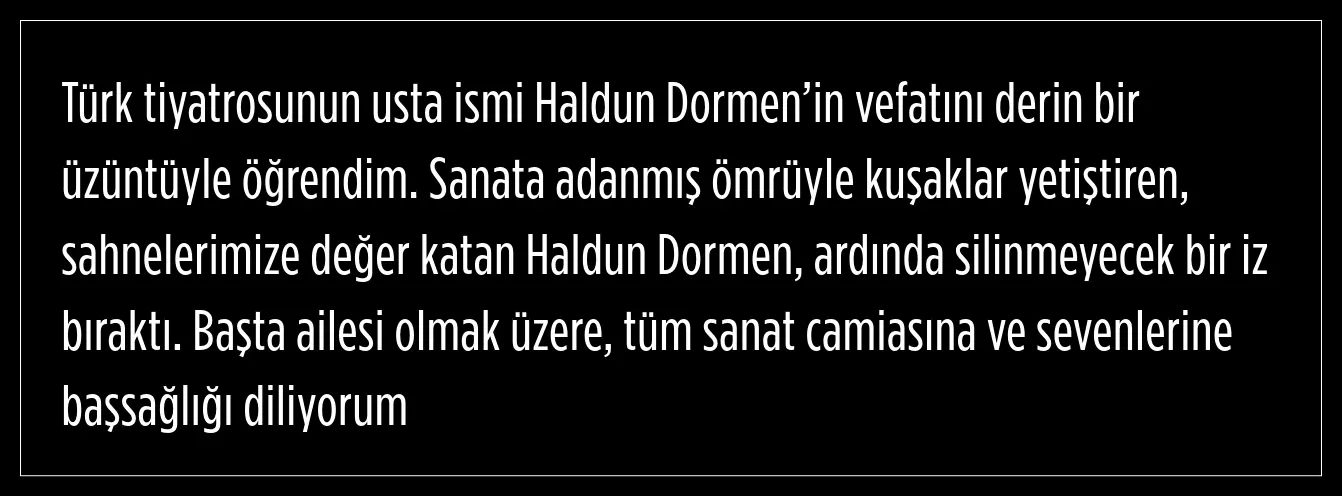 Yavaş, sanata adanmış ömrüyle kuşaklar yetiştiren, sahnelere değer katan Haldun Dormen'in ardında silinmeyecek bir iz bıraktığını söyledi.