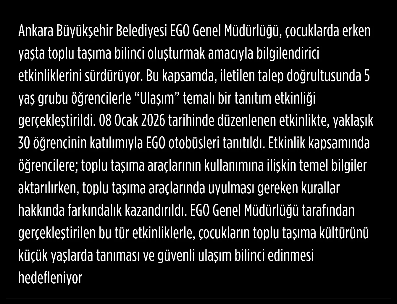 08 Ocak 2026 tarihinde düzenlenen etkinlikte, yaklaşık 30 öğrenciye EGO otobüsleri tanıtıldı.