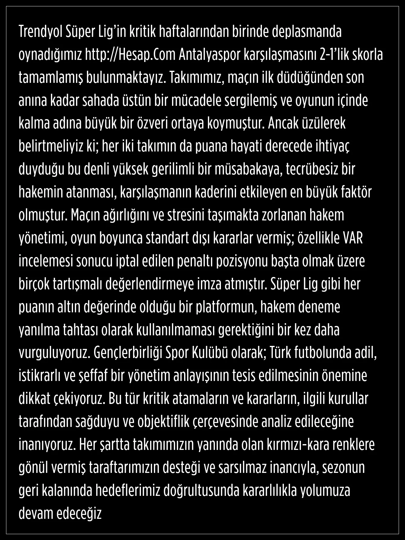 Gençlerbirliği, her iki takımın da puana hayati derecede ihtiyaç duyduğu bu denli yüksek gerilimli bir müsabakaya, tecrübesiz bir hakemin atandığını ve karşılaşmanın kaderini etkileyen en büyük faktör olduğunu söyledi.