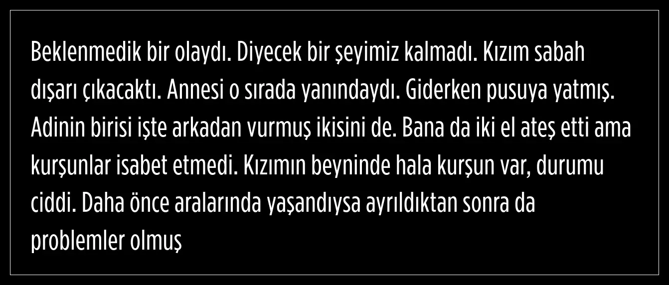 Bir süre apartmanda bekleyen şahıs, daha sonra kapıya çıkmak için yönelen eski eşine ve onun 73 yaşındaki annesi Ülker Koçak'a tabancayla ateş etti. Bartan, ardından aynı silahla intihar etti.