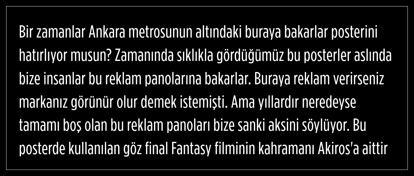 Ankara'da bir dönem metro altlarında sıkça karşımıza çıkan “Buraya Bakarlar" posterinin anlamı merak ediliyor. O posterin bir reklam panosu olduğu öğrenildi.