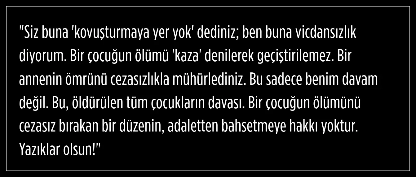 Nazlıcan Aygün, açıklamasında adalet sistemine yönelik sert ifadeler kullandı. Bir çocuğun yaşamını yitirmesinin cezasızlıkla sonuçlanmasının kabul edilemez olduğunu söyleyen Aygün, verilen kararın bir annenin ömür boyu taşıyacağı acıyı görmezden geldiğini savundu. Aygün, çocuk ölümlerine ilişkin dosyalarda sorumluların belirlenmemesinin, adalet kavramını zedelediğini ifade etti.
