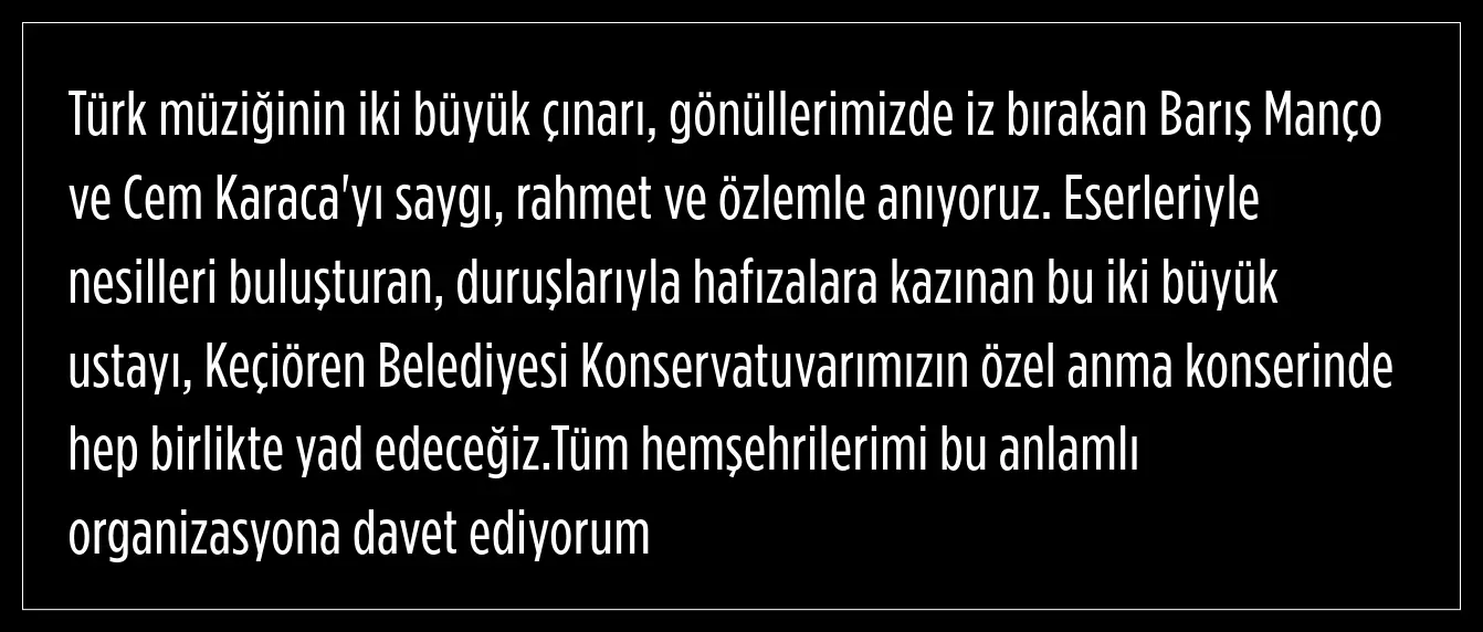 Keçiören Belediyesi, Türk müziğinin sevilen sanatçıları Barış Manço ve Cem Karaca'yı 3 Şubat Salı günü düzenleyeceği özel anma konseriyle anacak.