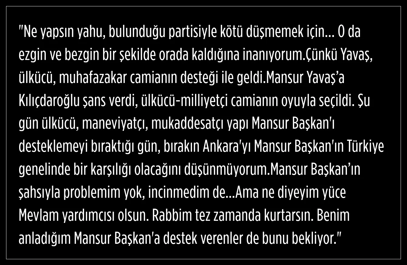 Açıklamalarında seçmen dengelerine dikkat çeken Özarslan, Mansur Yavaş’ın Kemal Kılıçdaroğlu’nun desteğiyle aday olduğunu ve ülkücü-milliyetçi oylarla seçildiğini söyledi. Özarslan’a göre muhafazakâr ve maneviyatçı seçmenin desteğini çekmesi halinde Yavaş’ın yalnızca Ankara’da değil, Türkiye genelinde de güçlü bir siyasi karşılığı kalmayacak.