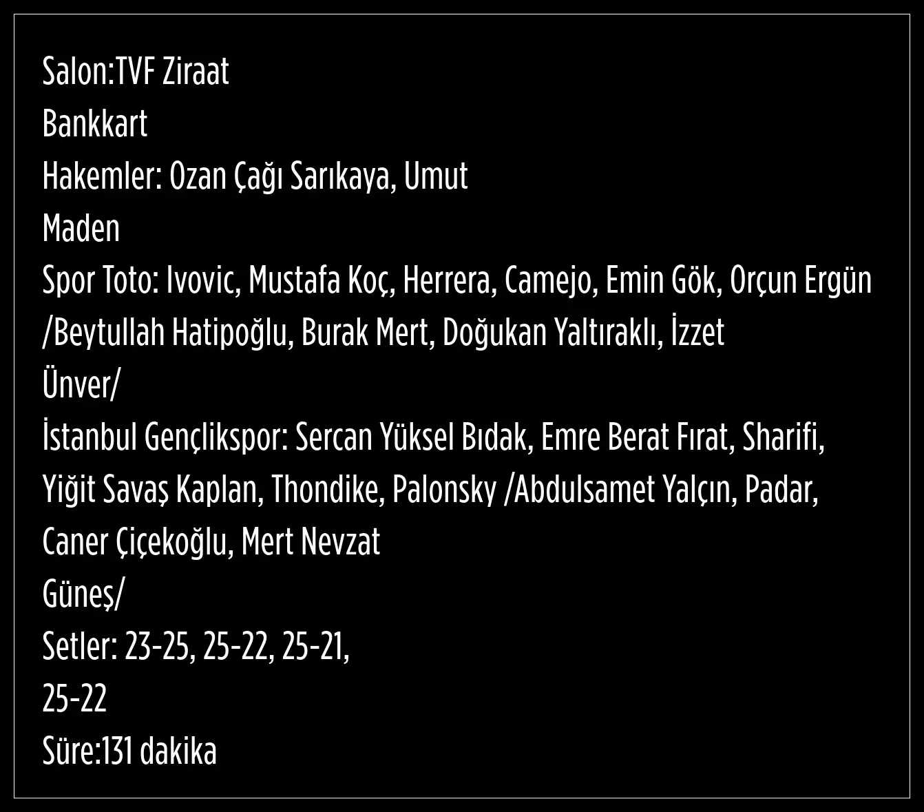 Orta setlerde savunma direncini artıran Ankara ekibi, bloklarda kurduğu üstünlükle rakibin ritmini bozdu. Kritik sayılarda hata yapmayan Spor Toto, mücadeleden 3-1 galip ayrıldı.